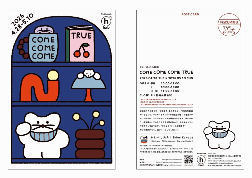 今回はまねきねこで有名な豪徳寺駅近くのカフェで開催という事もあり、まねきねこにまつわる作品とグッズを中心に展示販売予定です。